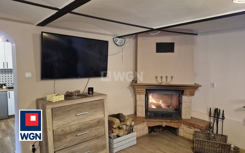 W salonie znajduje się klimatyczny kominek. Na piętrze domu są dwie przytulne sypialnie.