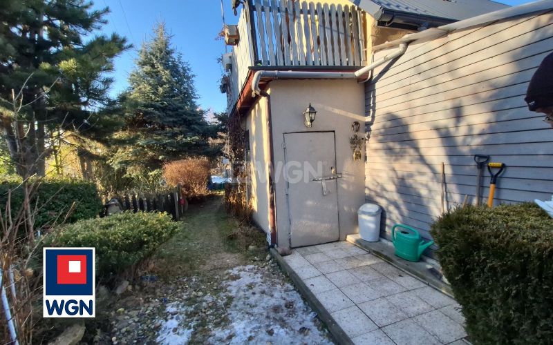 Przed domem znajduje się zadaszony taras a dalej na posesji garaż wolnostojący. W ogrodzie występują liczne nasadzenia.